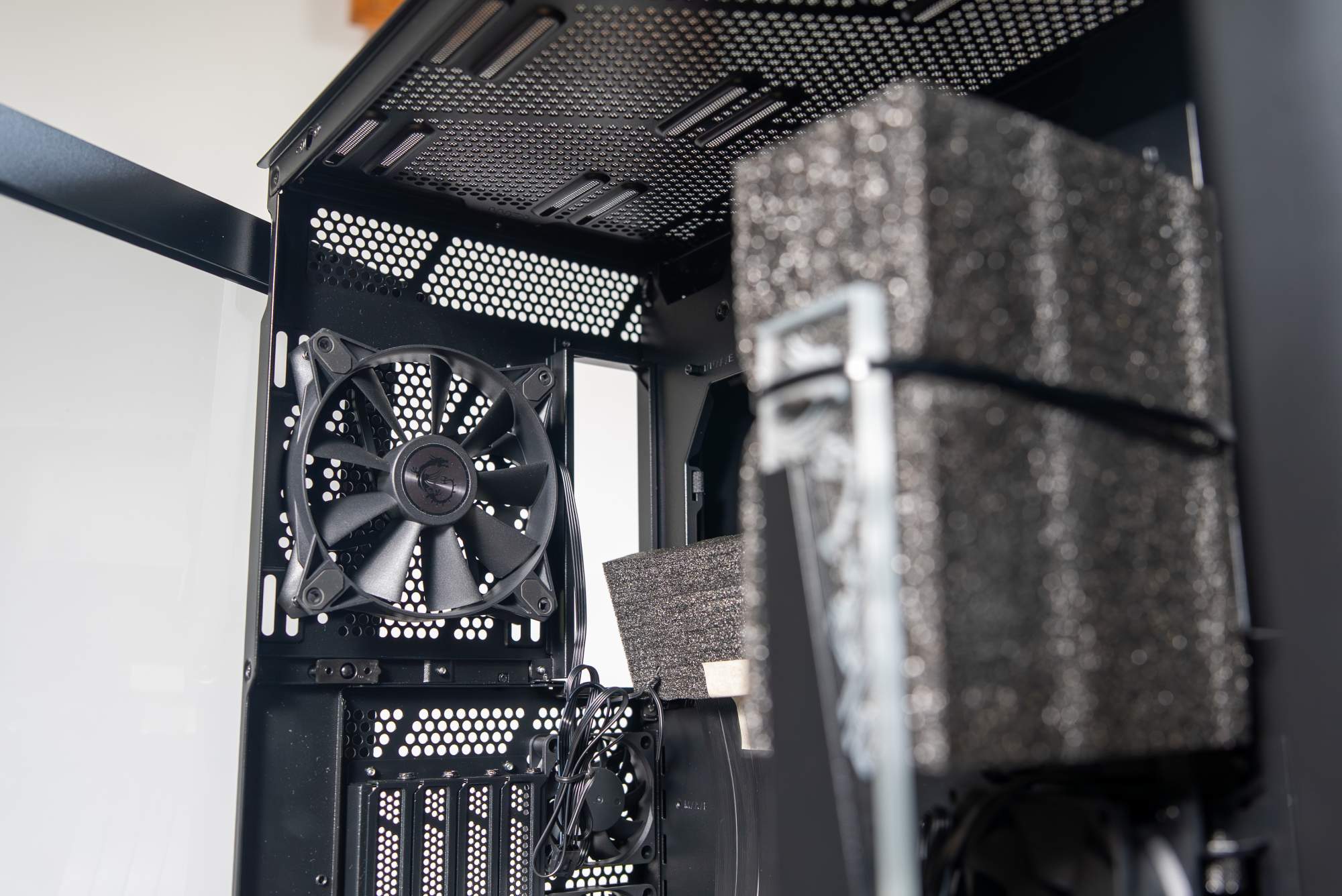 Liquid cooling support is also strong. The Gungnir 300P can fit two 360 mm radiators at the same time (one in the front and one at the top). It supports 120, 140, 240, 280, and 360 mm radiators at the front or top, and 120 or 140 mm at the rear. That allowed me to install an Arctic Liquid Freezer III 360 AIO in my build. A 360 mm radiator can be mounted at the front (with the front fans pushing air through the radiator) or at the top, although you should check compatibility with tall RAM modules. Fortunately, the case has about 80 mm of clearance above the motherboard, so even a push pull 360 mm setup is possible. With this, even a very hot CPU, like the 16 core Ryzen 9 9950X3D used in this build, can be cooled effectively without the case limiting you. Finally, with such an airy design and many fans, it’s worth noting that noise is under control. All fans are PWM, so you can control their speed through the motherboard based on temperature. At moderate RPM the case stays relatively quiet, and when you need maximum cooling, you have plenty of airflow headroom.