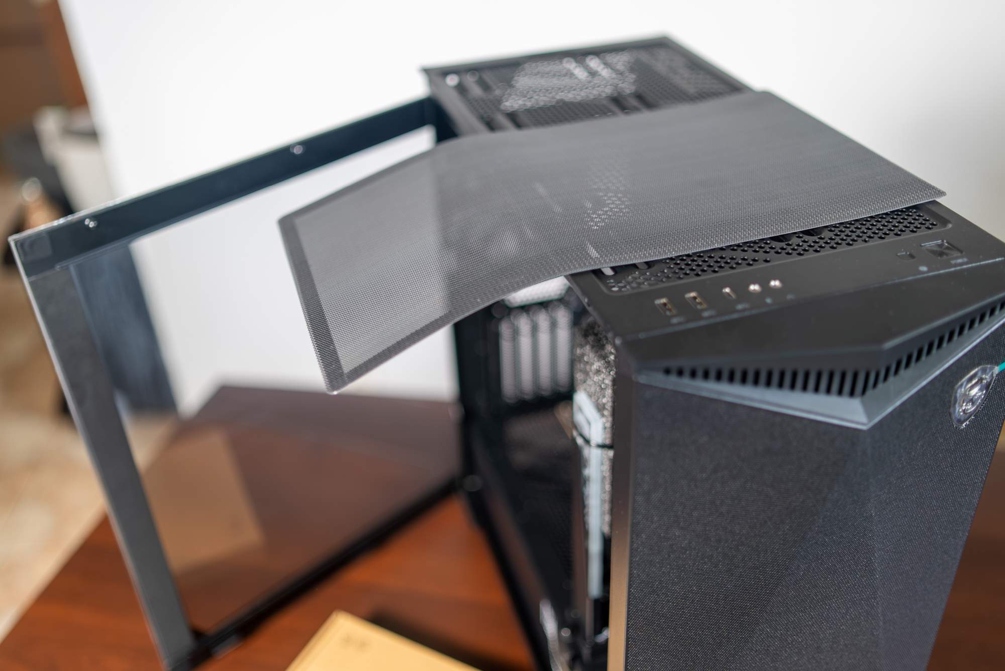 The Gungnir 300P Airflow stands out with an elegant, understated design and a solid build. It weighs about 11 kg, largely due to the use of thick steel and a lot of metal, which translates into high rigidity and durability. The tempered glass side panel (about 3-4 mm thick) lets you showcase internal components nicely and is mounted tool free (with thumbscrews), making access to the inside easier. The front is made from a single piece metal mesh with very fine openings (1 mm) across the entire surface, so fresh air can flow freely into the case while larger dust particles are stopped. The top panel is also perforated (and supports mounting fans or a radiator as well), which helps exhaust heat upward. To keep things clean, dust filters are placed at every intake area: at the front, at the top, and at the bottom intake for the power supply.