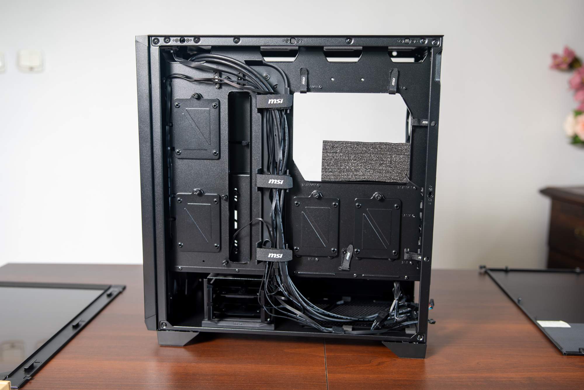 MSI put a lot of effort into cable management. Behind the motherboard tray there’s sufficient clearance and a cable routing system with plenty of cutouts plus Velcro straps and mounting points. That makes it easy to route everything behind the tray and bundle it neatly. As a result, you barely see any cables in the main chamber, which improves both aesthetics and airflow. There’s no cable mess, and hiding the wiring was straightforward thanks to the clever design and many tie down points. An extra touch is the large cable cover panel near the front edge of the motherboard tray, which hides the cable bundles going from the PSU shroud up to the motherboard. This panel plays three roles: it improves looks, stiffens the structure, and it also includes a fan mounting spot (with an 80 mm intake fan installed there from the factory).