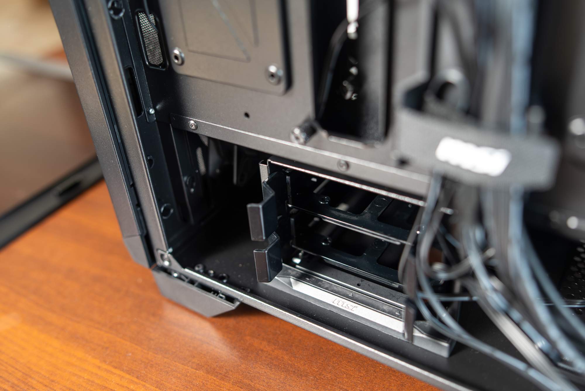 For storage, there’s room for up to 8 drives total: up to 6x 2.5 inch SSDs and 2x 3.5 inch HDDs (which can also fit 2.5 inch drives). Four of the six 2.5 inch positions are vertical SSD mounts placed behind the motherboard tray (drives mounted vertically on dedicated brackets), which lets you mount them neatly without disrupting airflow in the main chamber. In addition, the PSU tunnel can hold two more SSDs (as long as you don’t use that space for fans), and there’s a modular 3.5 inch drive cage. The HDD cage fits two 3.5 inch drives (or 2.5 inch) and importantly it’s slide out, adjustable, and even fully removable during installation or when you want more room for cables or better airflow. The drive tray slides out quickly thanks to a latch mechanism. If needed, you can move it or remove it without tools, which makes working inside the case much easier.